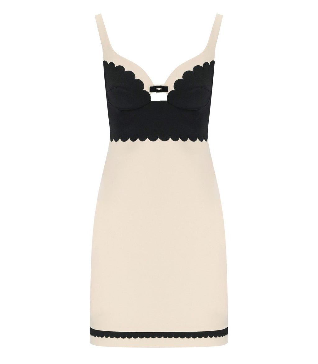 Tubino Elisabetta Franchi dal design femminile e ricercato, con dettagli smerlati sul petto e sul fondo. Dettagli iconici come il fiocchetto in taffetà con punto luce effetto oro e brillanti. Spalline elastiche e regolabili con ricamo,il busto è semi-strutturato con fodera interna. Chiusura posteriore con zip invisibile per una vestibilità comoda e impeccabile.