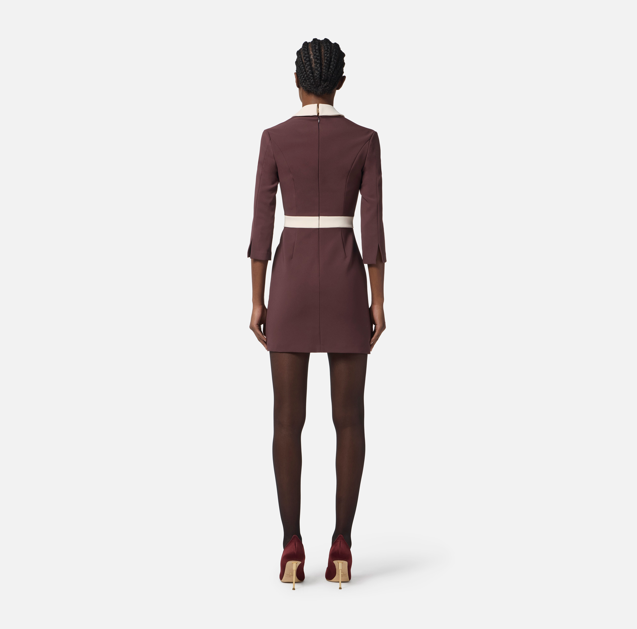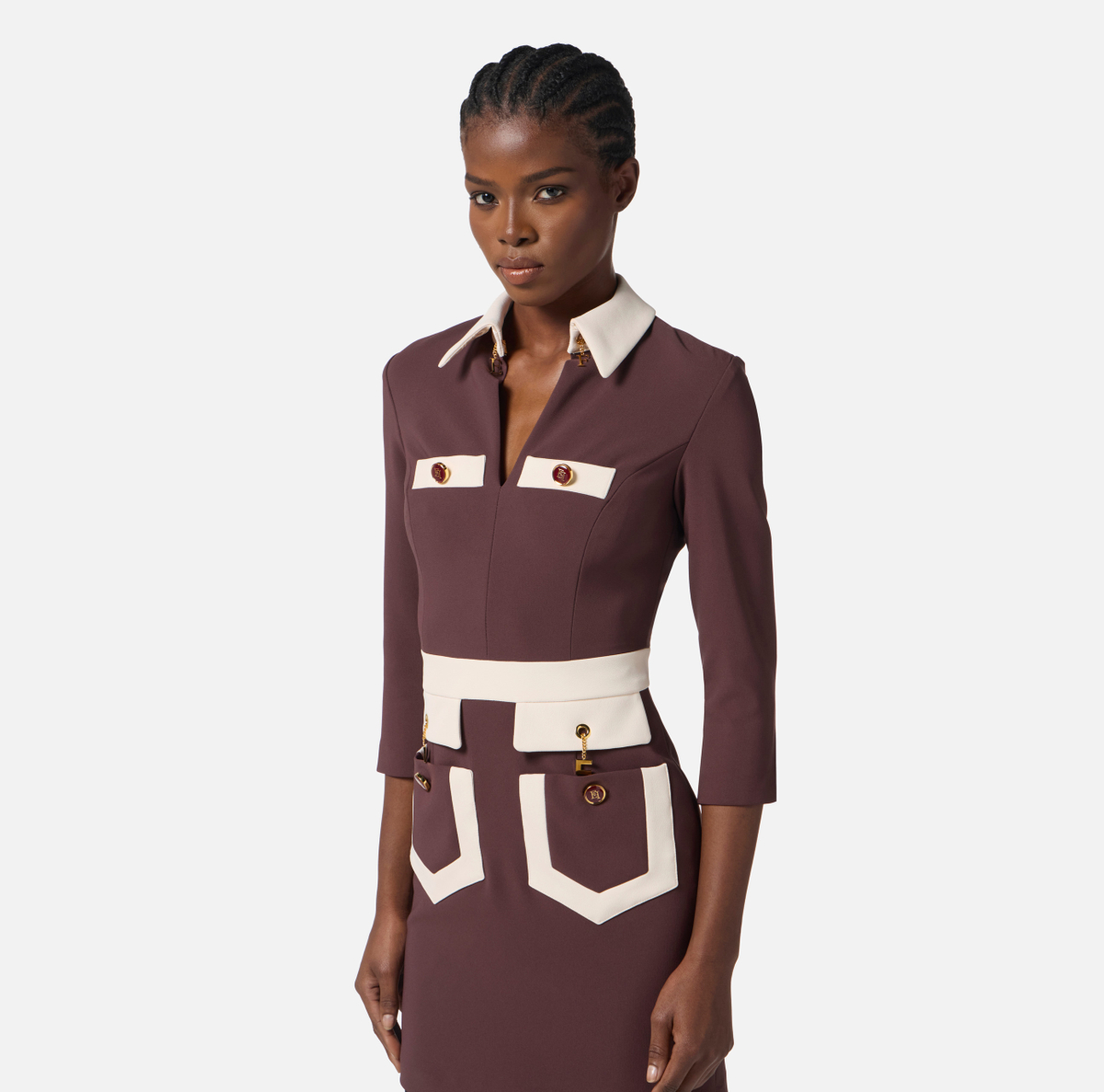 Abito in doppio crêpe dalla vestibilità aderente. Il vestito si distingue per il colletto a vela, i filetti, la fascia con patte e i bordi tasca in toni a contrasto, per sofisticati color-block. Focus sui dettagli: i bottoni smaltati e i gemelli con charms pendenti creano movimento e lucentezza.