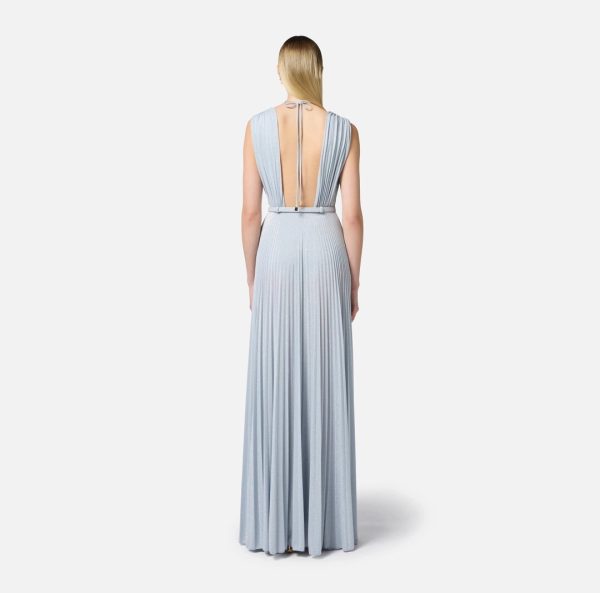 Abito da sera in jersey lurex. Il vestito è smanicato con schiena scoperta e ha collo gioiello con struttura tubolare. Una fitta pieghettatura plissé si libera su tutta la lunghezza, aprendosi in due ampi spacchi. A completare, la cintura con logo. Vestibilità slim.