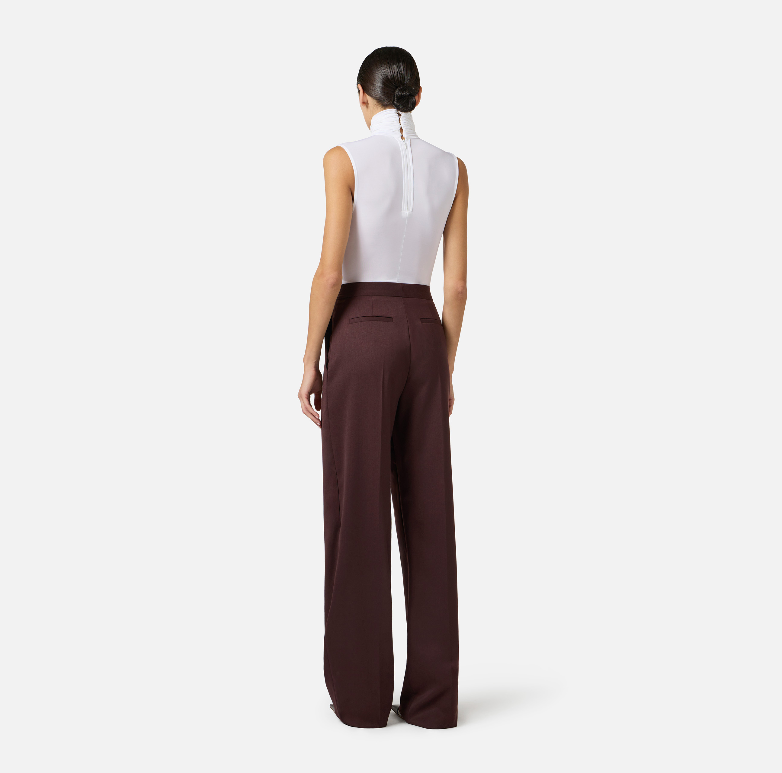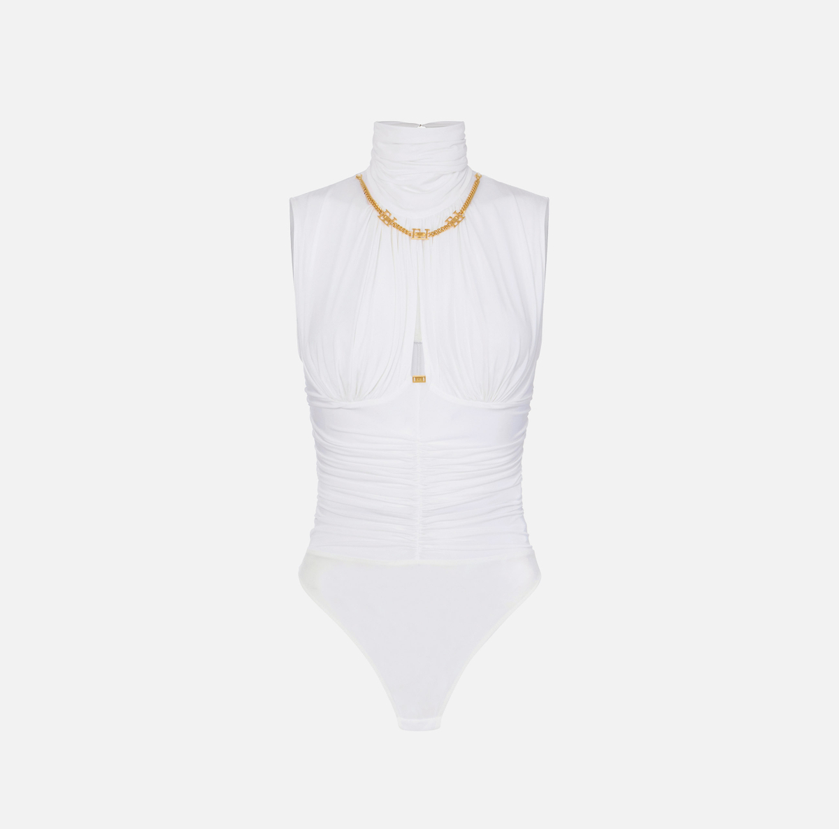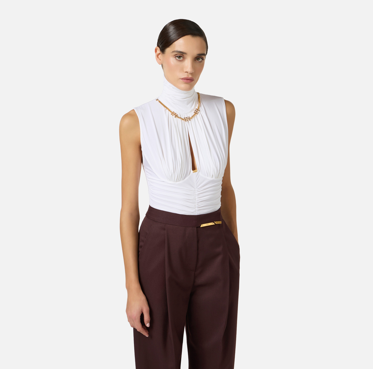 Body in jersey crêpe leggero, senza maniche e con spalle strutturate. Protagonisti sono i drappeggi che definiscono la silhouette con sofisticati volumi. L’accessorio gioiello in catena incornicia il collo e regala luce con dettagli logo. Vestibilità aderente.
