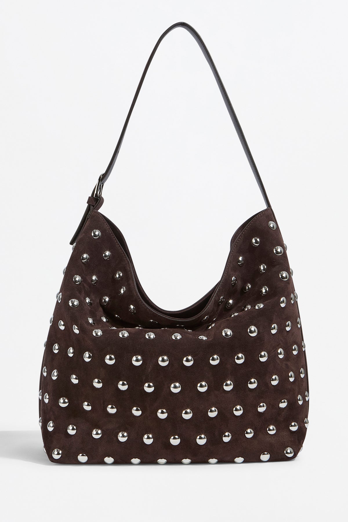 BORSA A SPALLA IN VITELLO SCAMOSCIATO MARRONE CON APPLICAZIONE DI BORCHIE SFERICHE METALLICHE. LINEA MORBIDA A SECCHIELLO. CHIUSURA INTERNA CON MOSCHETTONE METALLICO. TRACOLLA REGOLABILE CON FIBBIA. INTERNO FODERATO.