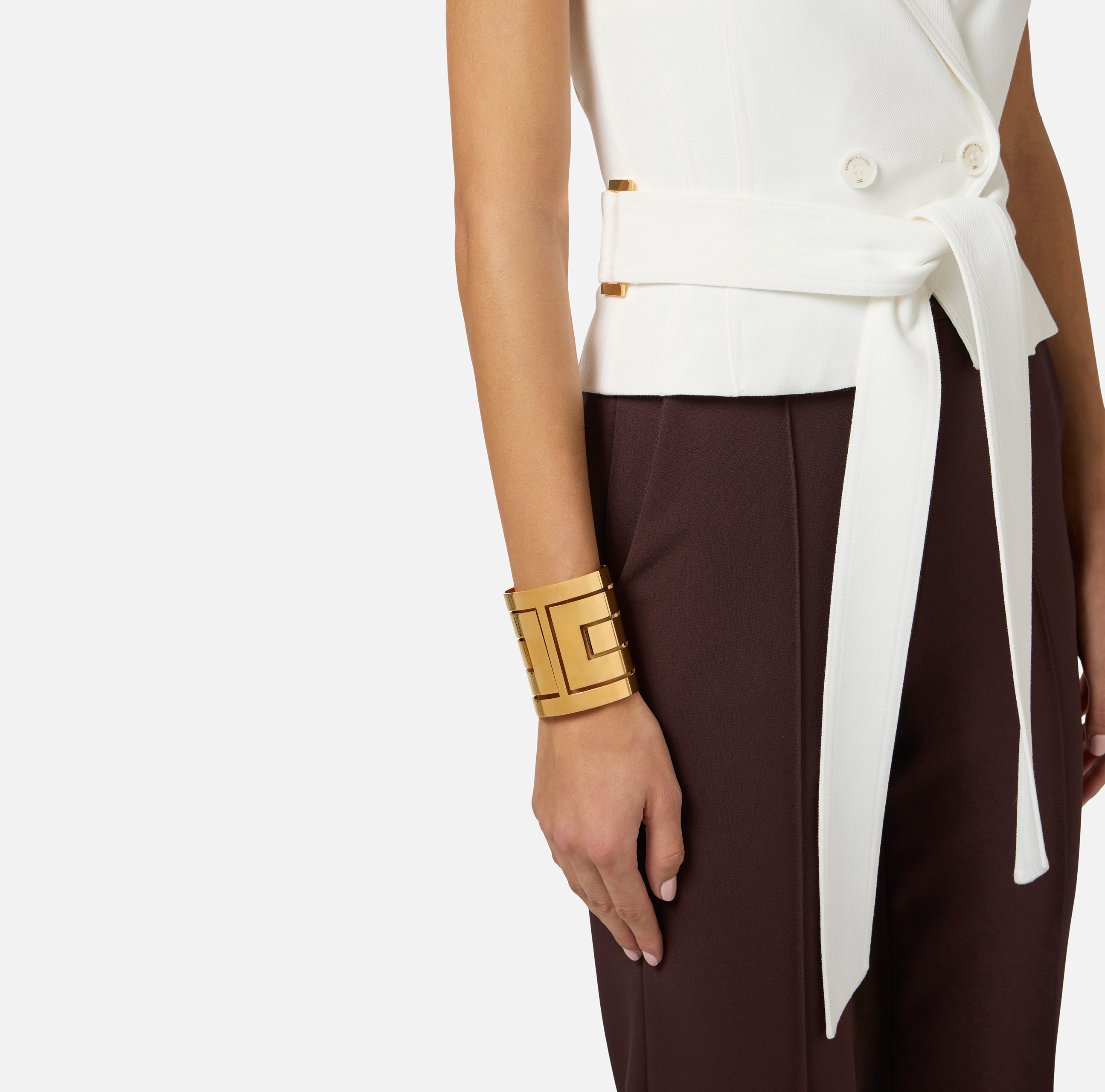 Bracciale cuff realizzato in metallo con finitura dorata. Dal design avvolgente, si distingue per le traforature con elementi a rilievo che disegnano la forma del logo.