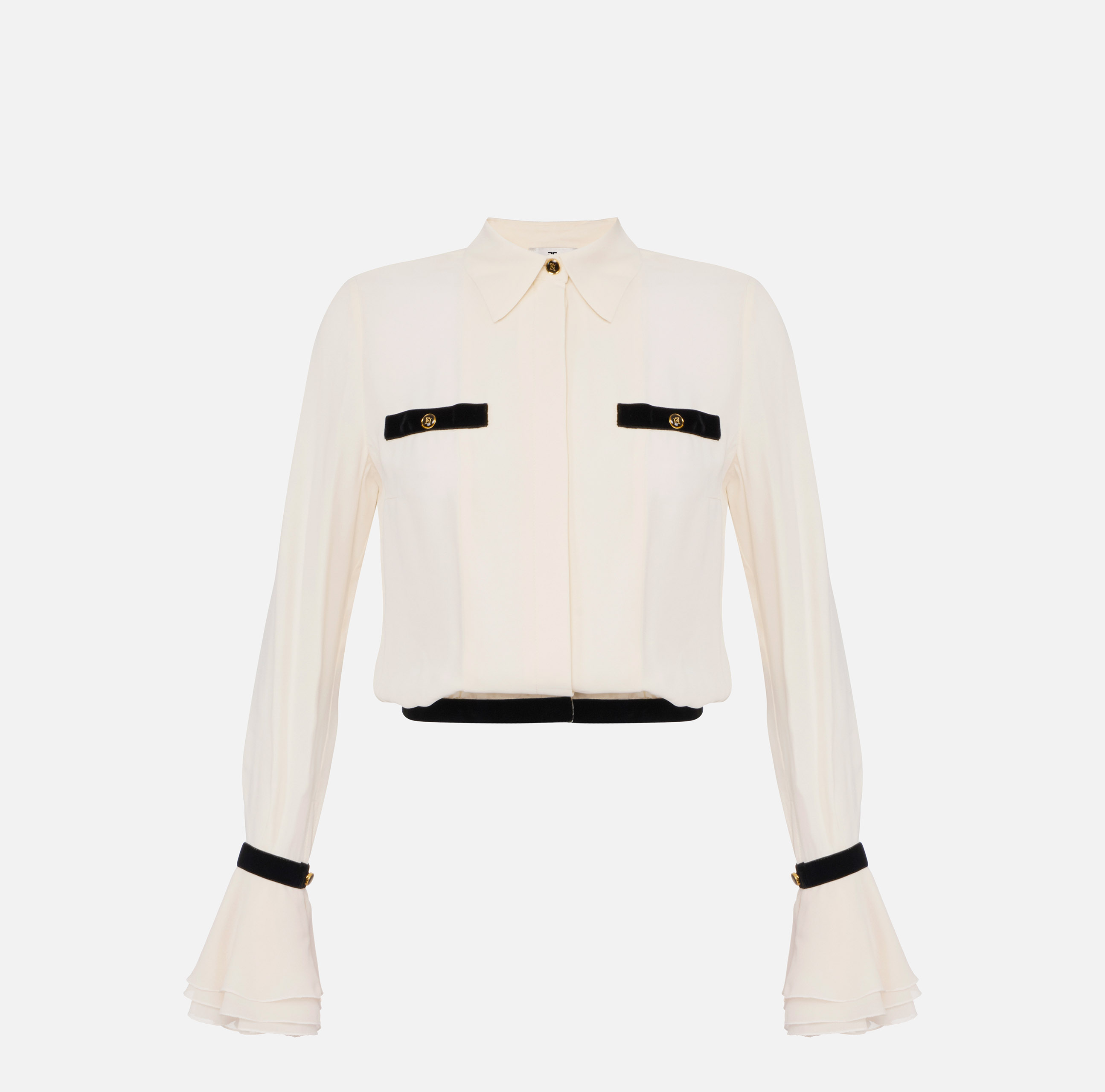 Camicia in georgette dalla vestibilità slim. Ha colletto classico e plastron sul davanti a donare struttura. Si distingue per i tripli polsi a campanella che aggiungono un’ultima nota di leggerezza al capo. Impreziosita dai bottoni smaltati con logo.