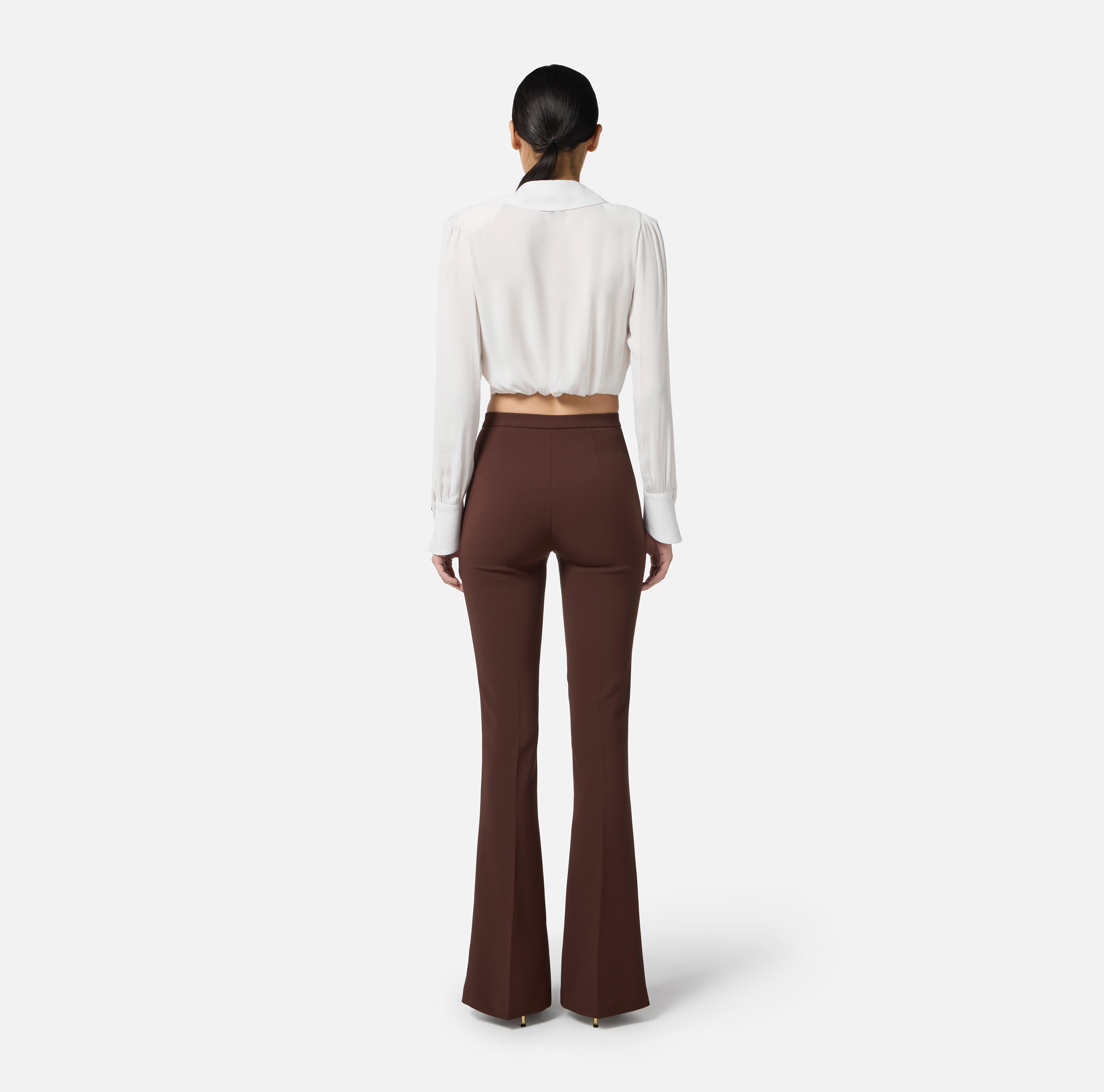 Camicia cropped in georgette dalla vestibilità slim. Ha collo a camicia con scollo a V incrociato, maniche lunghe con polsi asimmetrici ed è illuminata dal dettaglio gioiello in catena con logo, amovibile per sperimentare più opzioni di styling. Bottoni smaltati sui polsi.