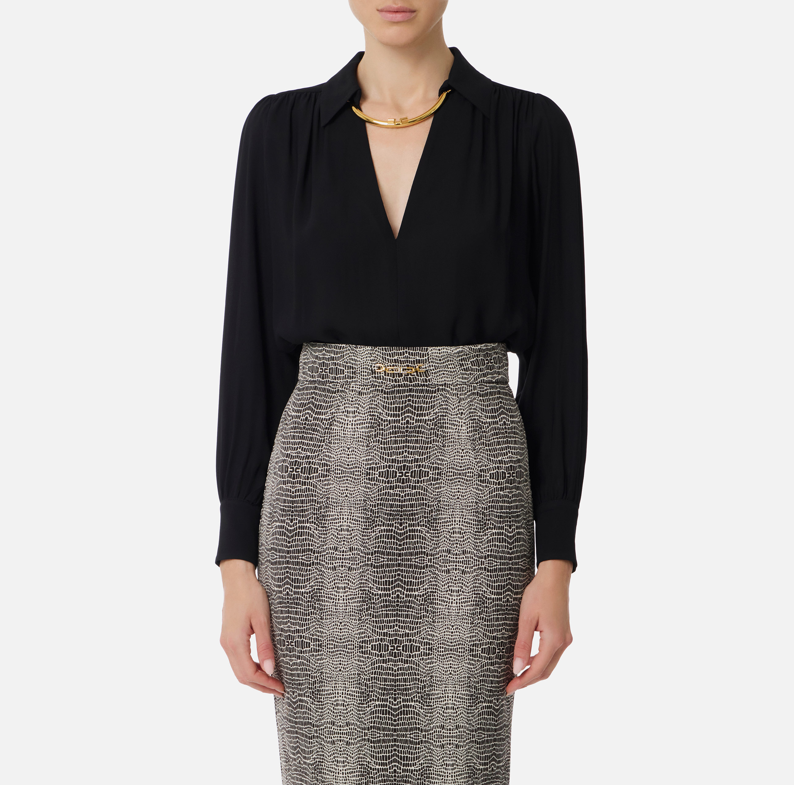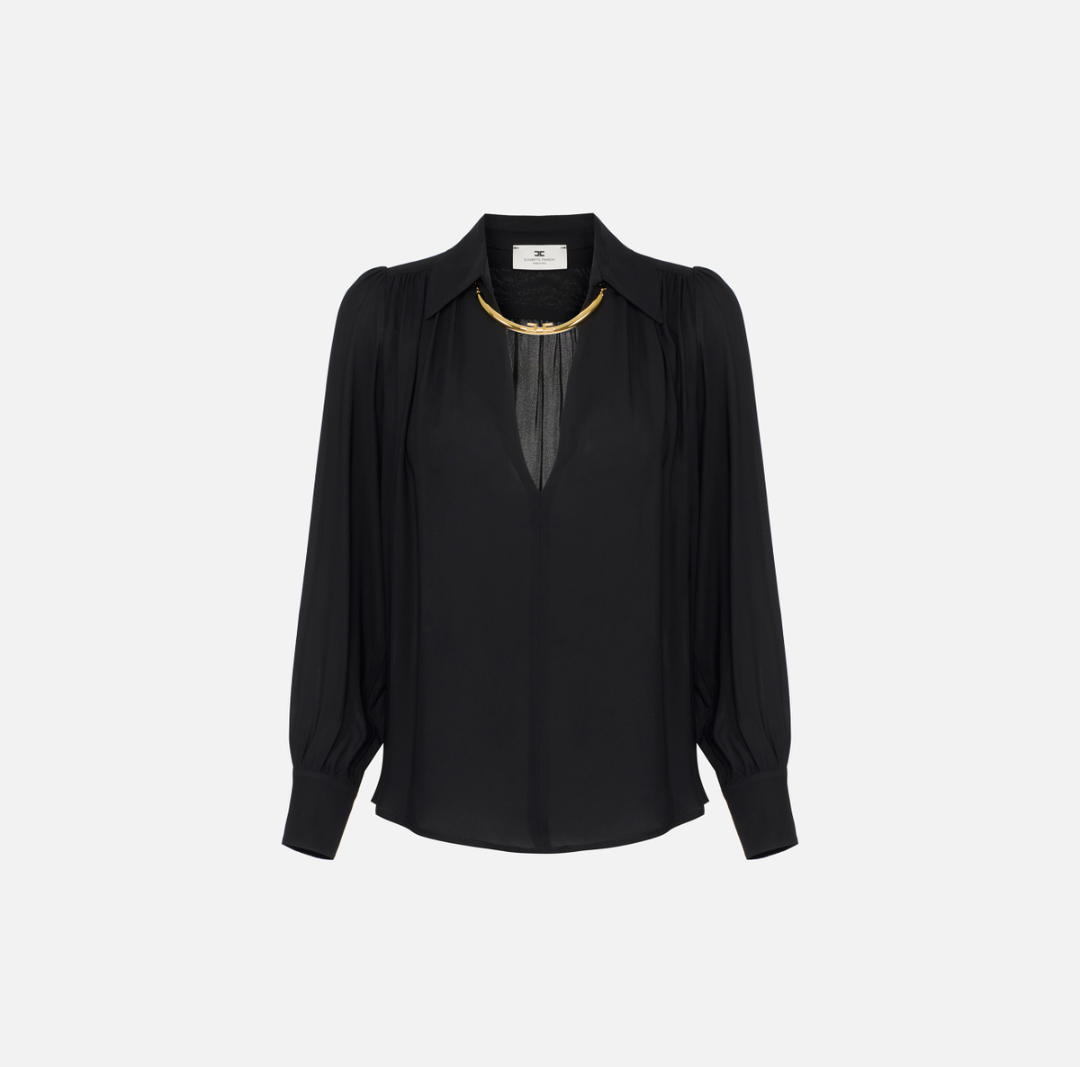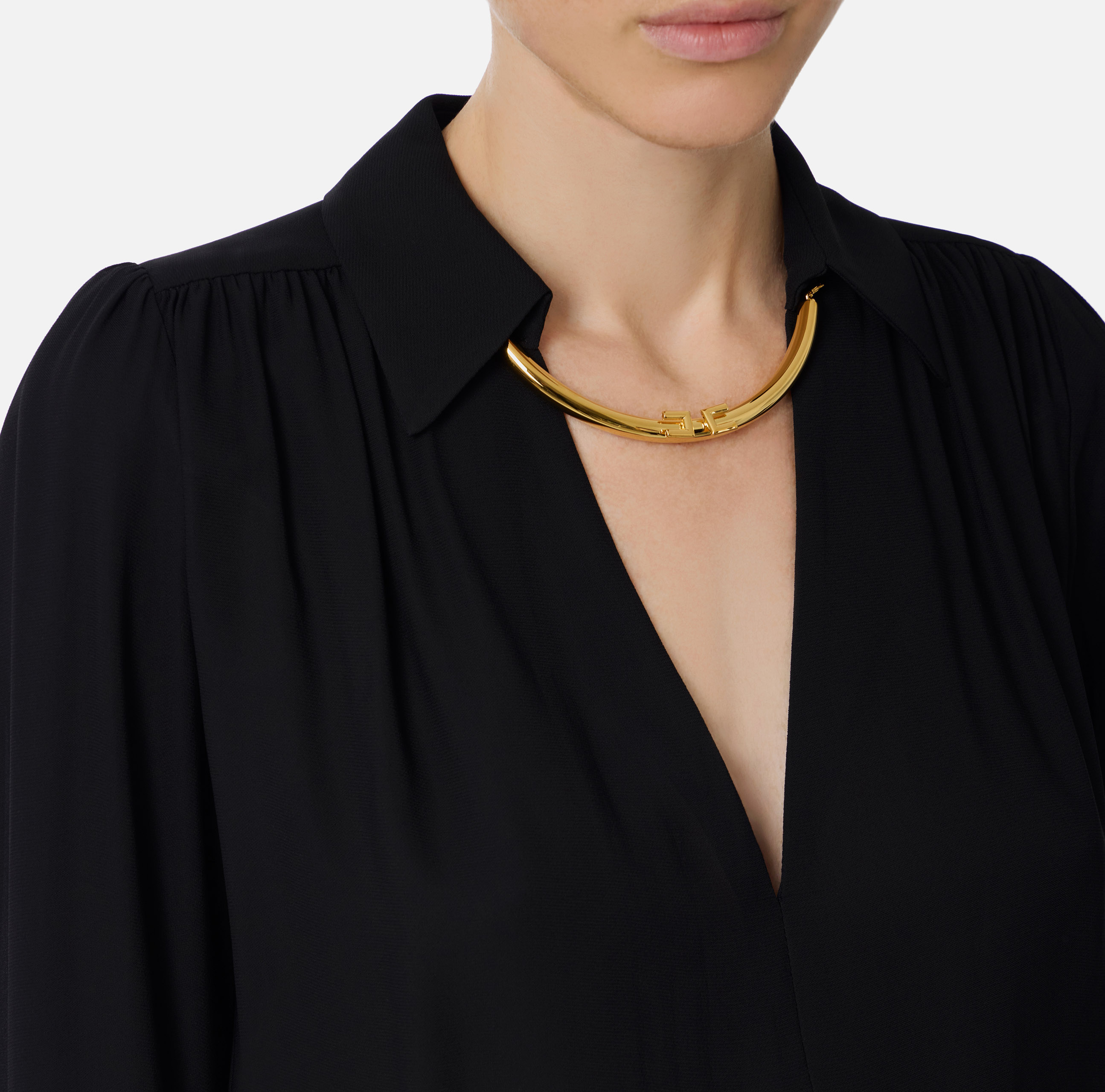 Camicia in georgette di viscosa dalla vestibilità slim. Ha colletto a camicia con scollo a V e maniche lunghe con polsi alti. Impreziosita dall’accessorio gioiello con logo ed elementi tubolari in metallo dorato, amovibile per sperimentare più opzioni di styling.