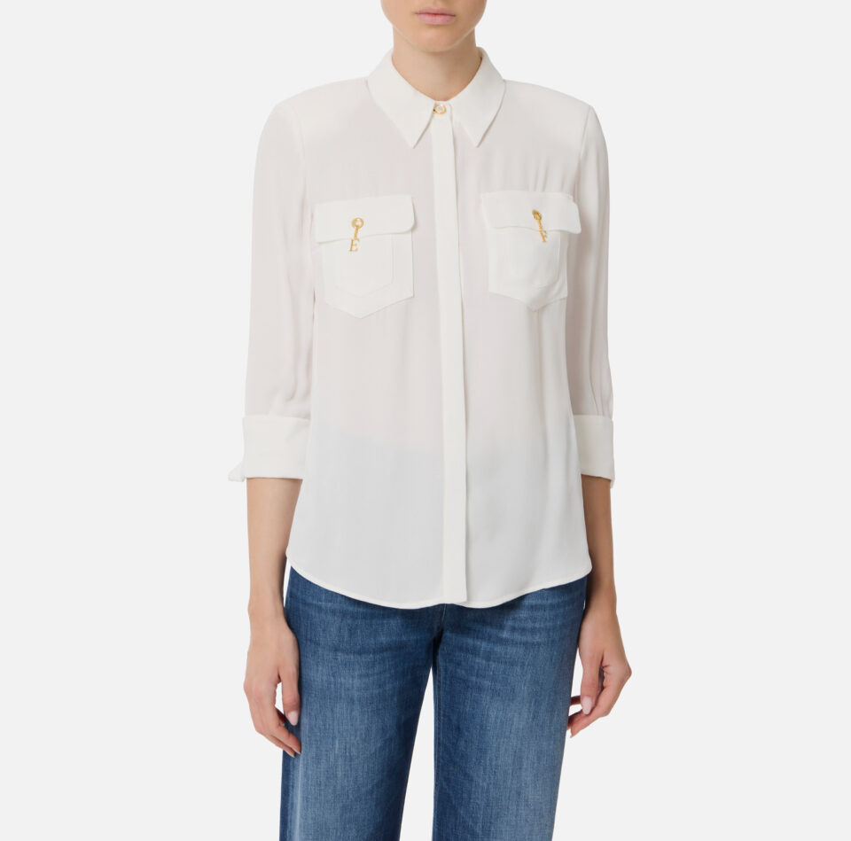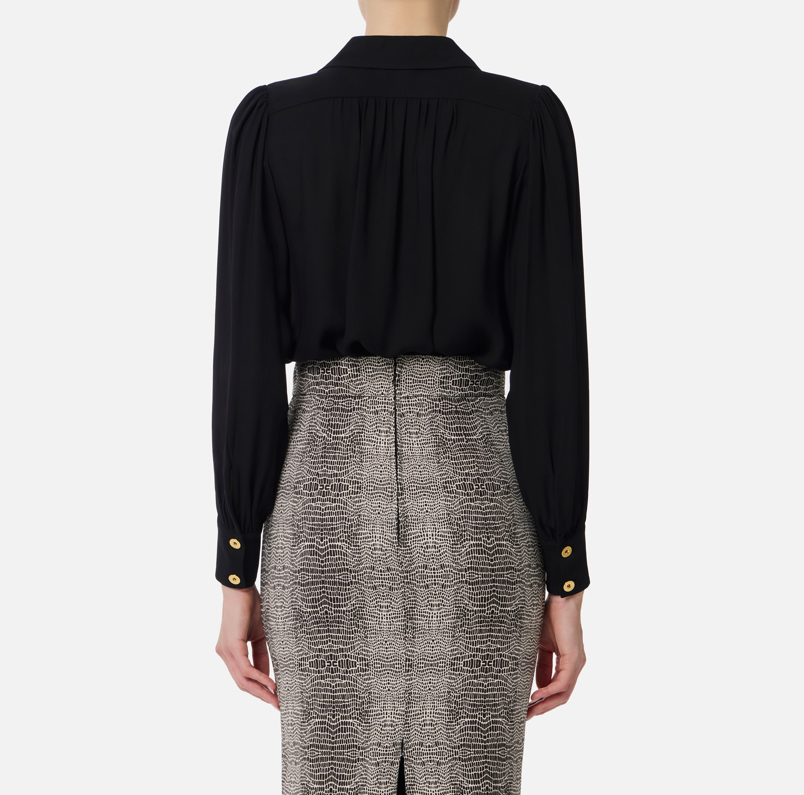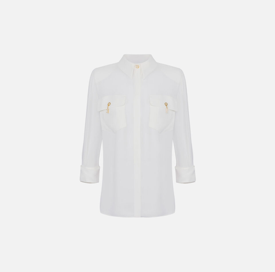Camicia in georgette di viscosa dalla vestibilità slim. Ha colletto a camicia con scollo a V e maniche lunghe con polsi alti. Impreziosita dall’accessorio gioiello con logo ed elementi tubolari in metallo dorato, amovibile per sperimentare più opzioni di styling.