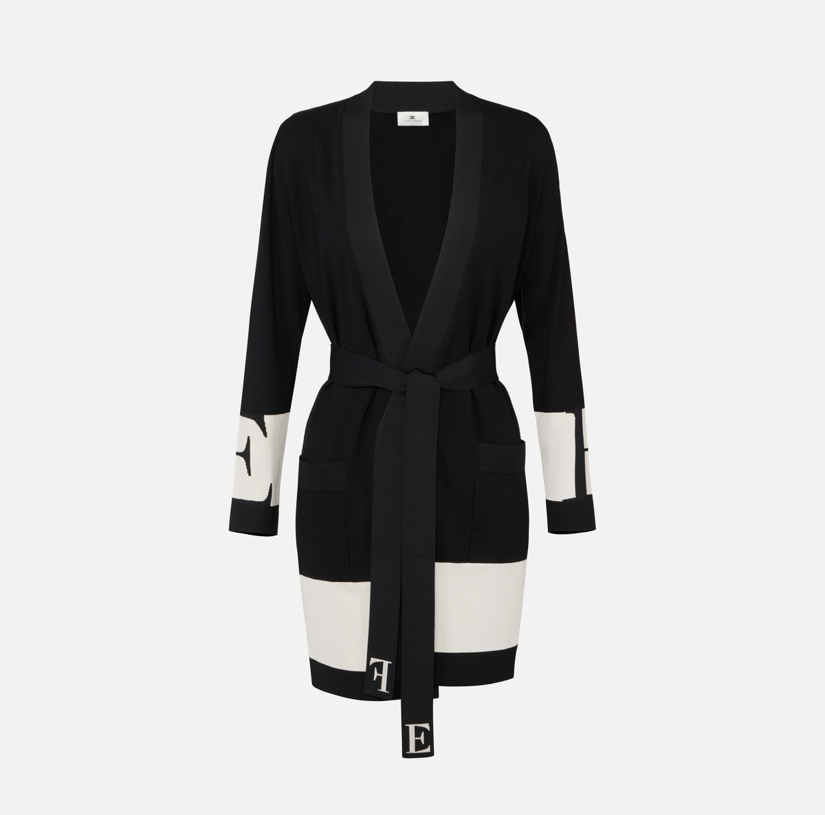- ICardigan a vestaglia in viscosa dalla vestibilità regular. Dalla linea avvolgente, si distingue per i loghi intarsiati in viscosa lucida sulle maniche, sul retro e alle estremità della cintura, a creare dei decisi effetti color-block. Tasche applicate.