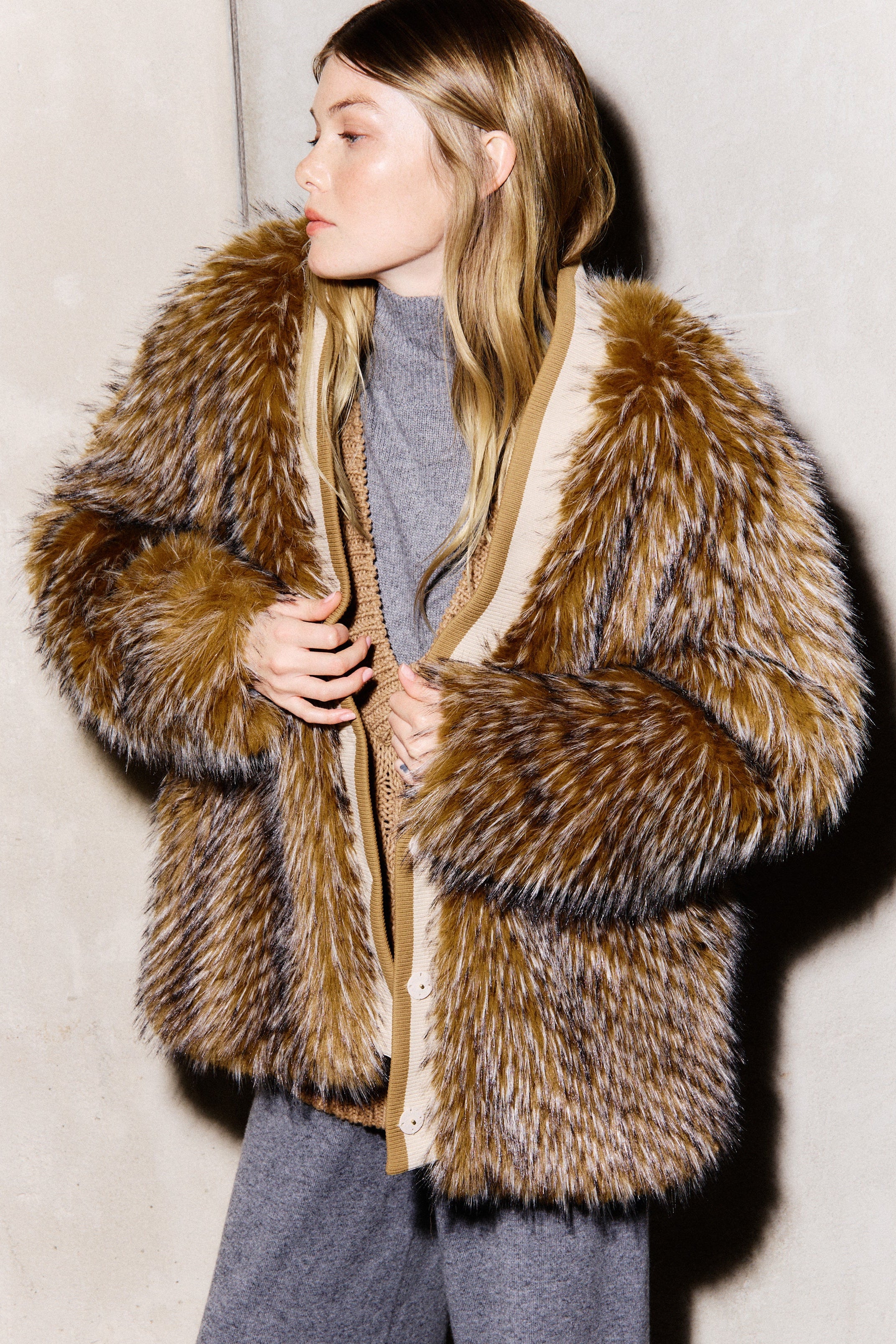 Ecopelliccia in ecomurmasky con bordi a contrasto, sinonimo di stile e praticità. Caldo e chic, completa con eleganza i look invernali, aggiungendo un tocco moderno e femminile.
