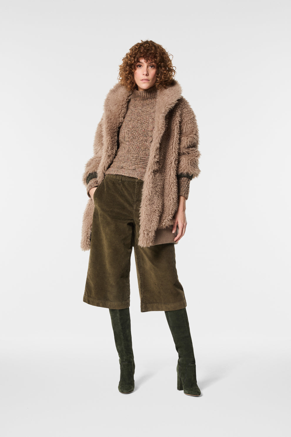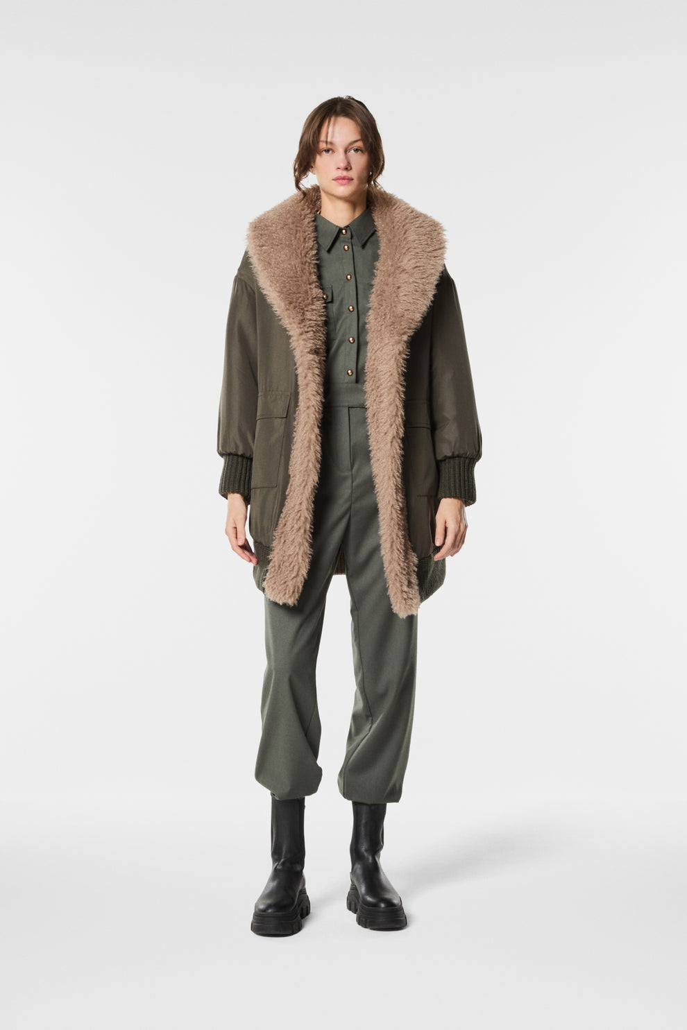 Da un lato nylon tecnico per un effetto moderno e leggero, dall’altro ecopelliccia curly per calore e stile. Reversibile e pratico, trasforma ogni outfit con un tocco sofisticato e confortevole, ideale da abbinare a pantaloni o gonne.