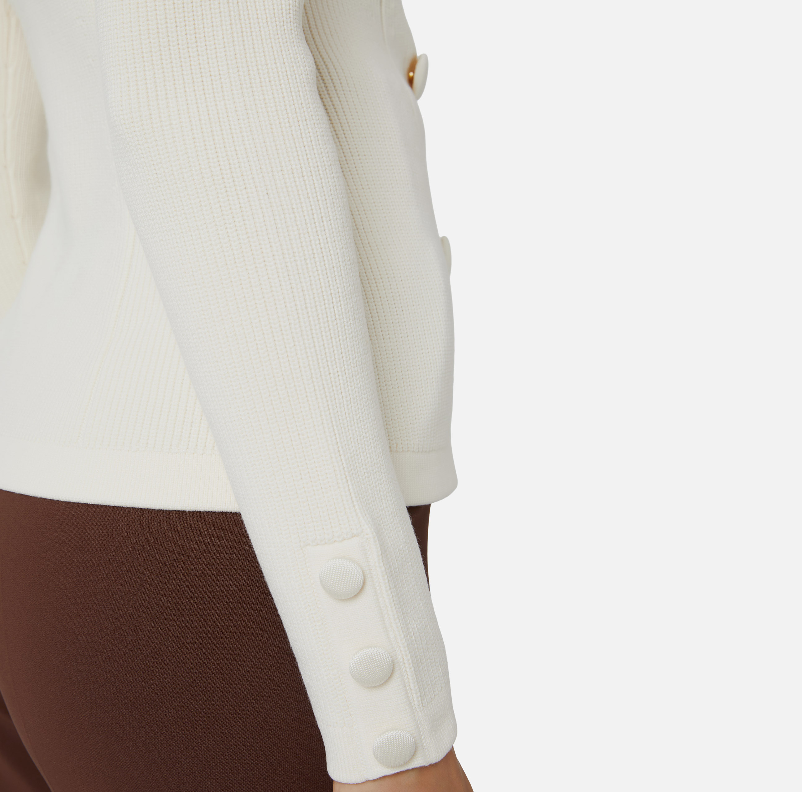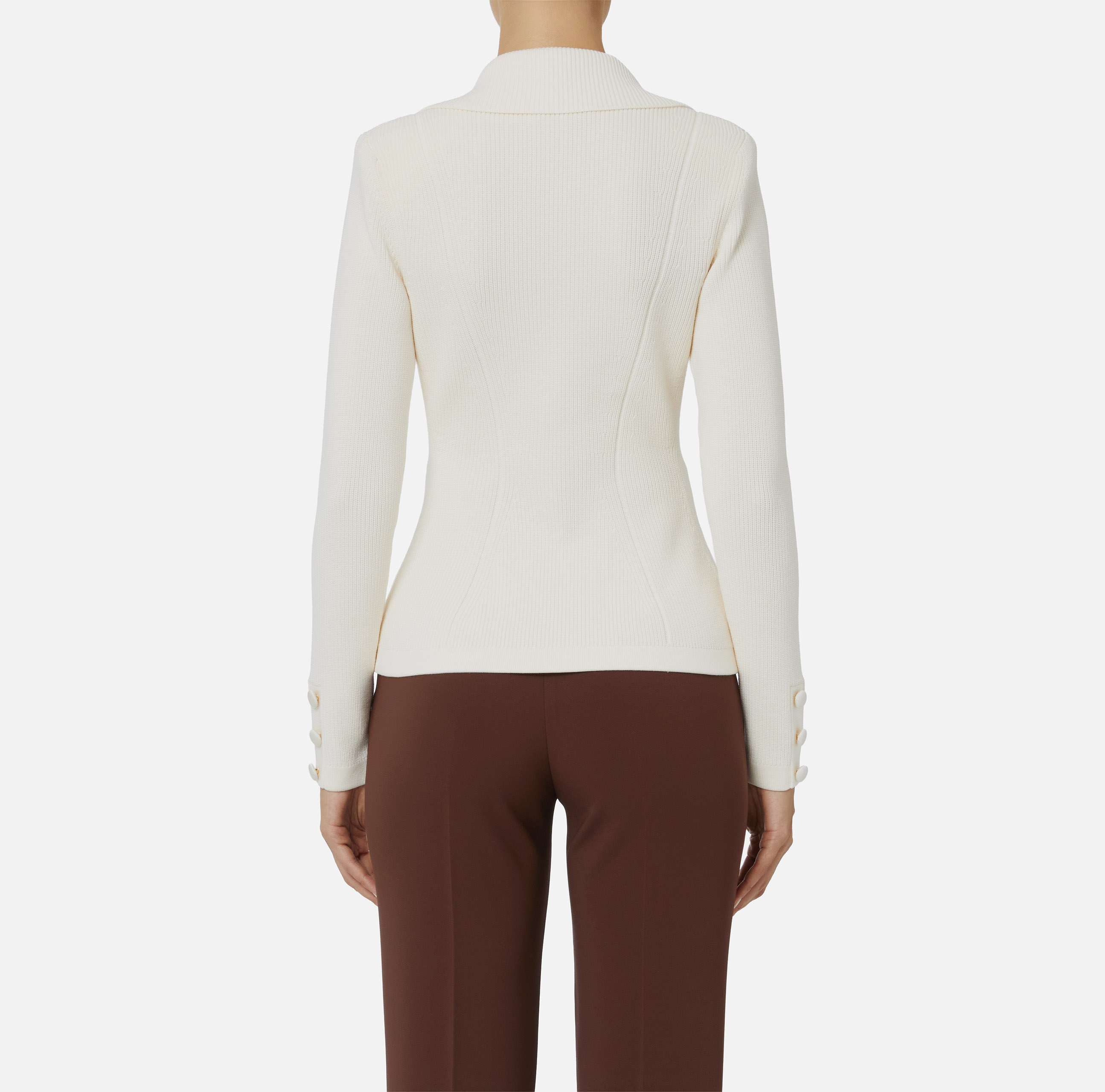 Giacca doppiopetto in maglia dalla vestibilità slim. Il blazer ha maniche lunghe e si distingue per il rever realizzato in viscosa lucida e i bottoni coordinati. Rifinita a coste inglesi, per una trama compatta e dinamica.