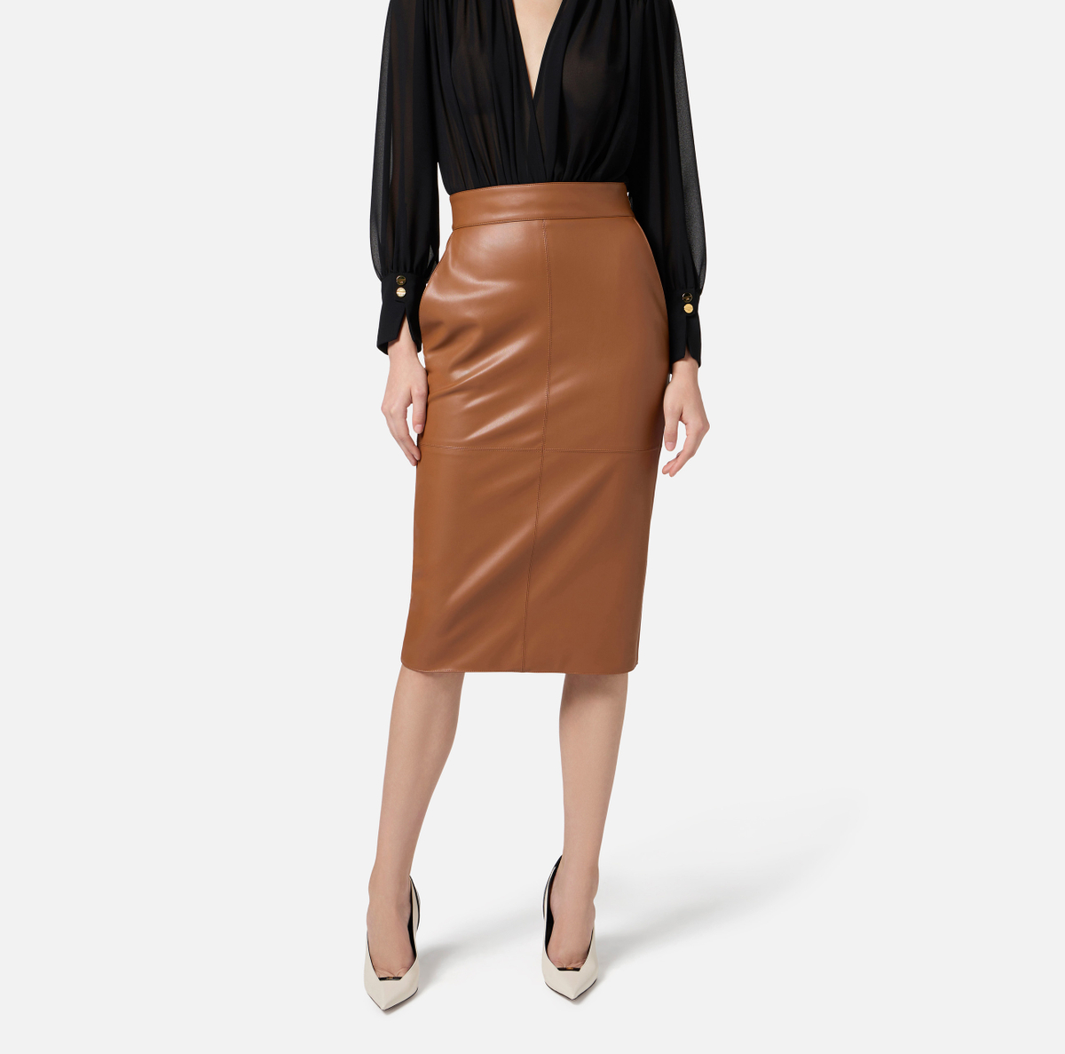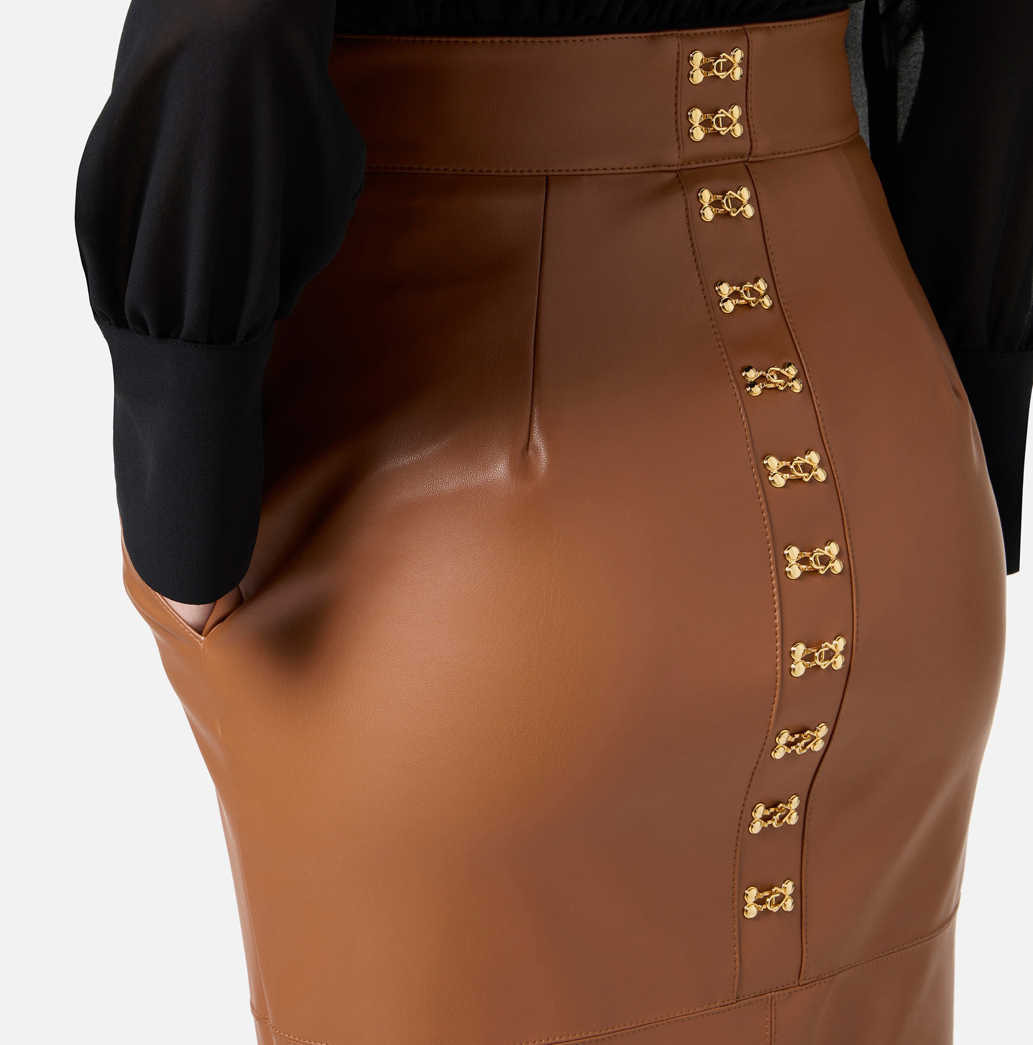 Gonna a tubino realizzata in materiale sintetico effetto nappa. Si distingue per i tagli con cuciture che donano struttura al capo. Sorprende il retro con ganci gioiello in metallo dorato, a regalare ispirazioni di gusto corsetteria. Vestibilità aderente.