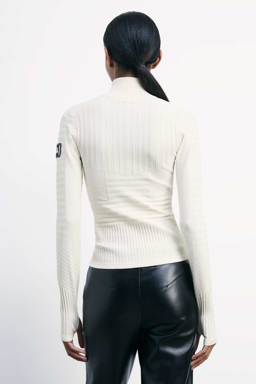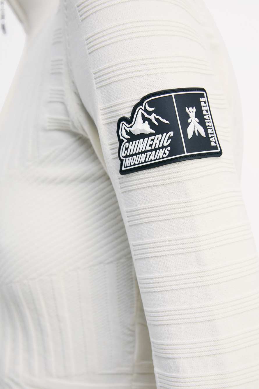 La capsule Chimeric Mountains presenta la maglia tecnica a collo alto con zip, calda e confortevole, progettata per accompagnare le performance sulla neve garantendo libertà di movimento e comfort termico. Perfetta da indossare sotto la tuta da sci coordinata.