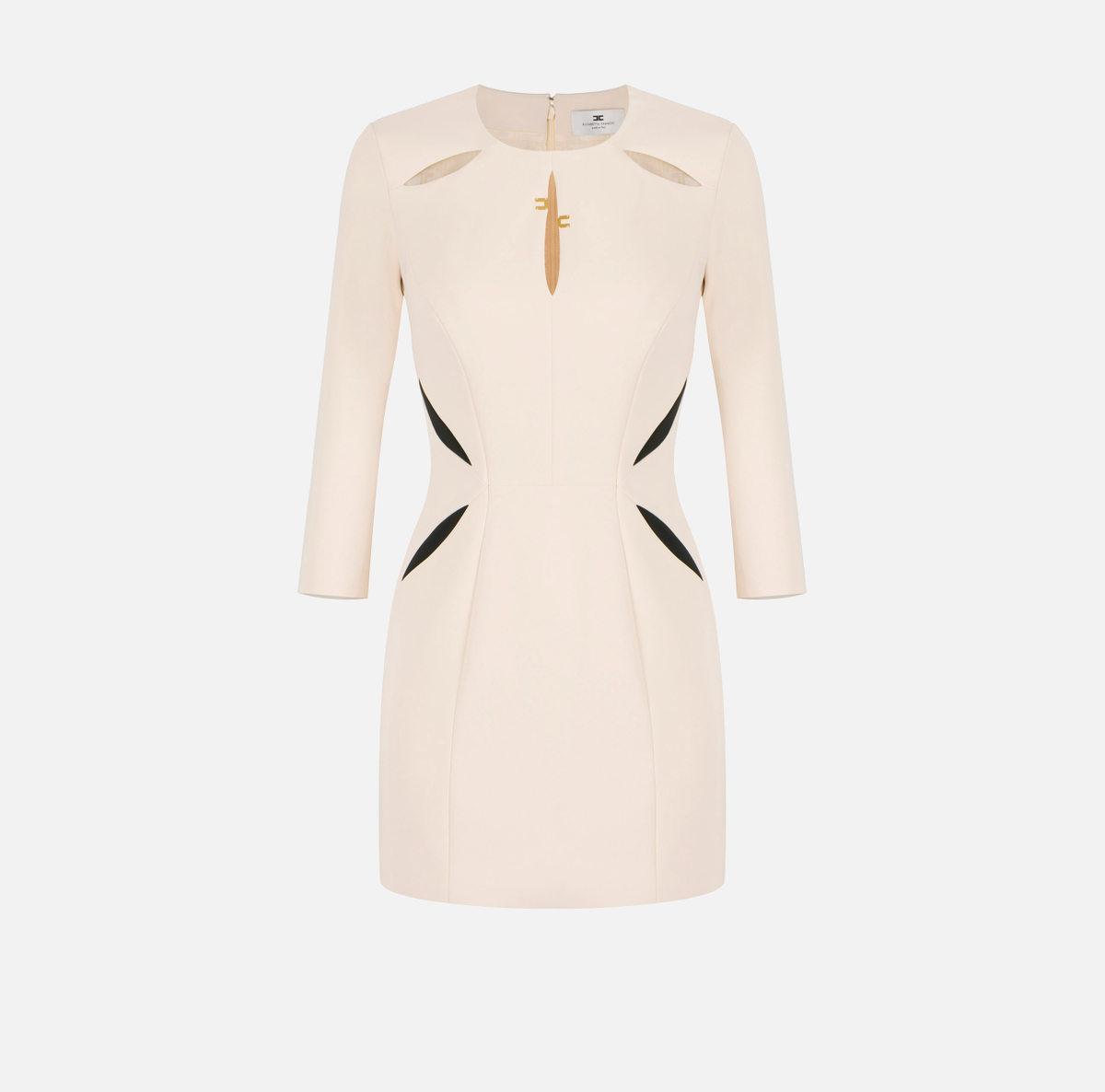 Mini abito in crêpe leggero dalla vestibilità regular. Il vestito ha girocollo e maniche 3/4. Si distingue per le aperture e i cut-out sovrapposti su tessuto bicolore, a ricreare un intarsio geometrico di ispirazione floreale. Sul busto, dettagli con logo posizionati asimmetricamente.