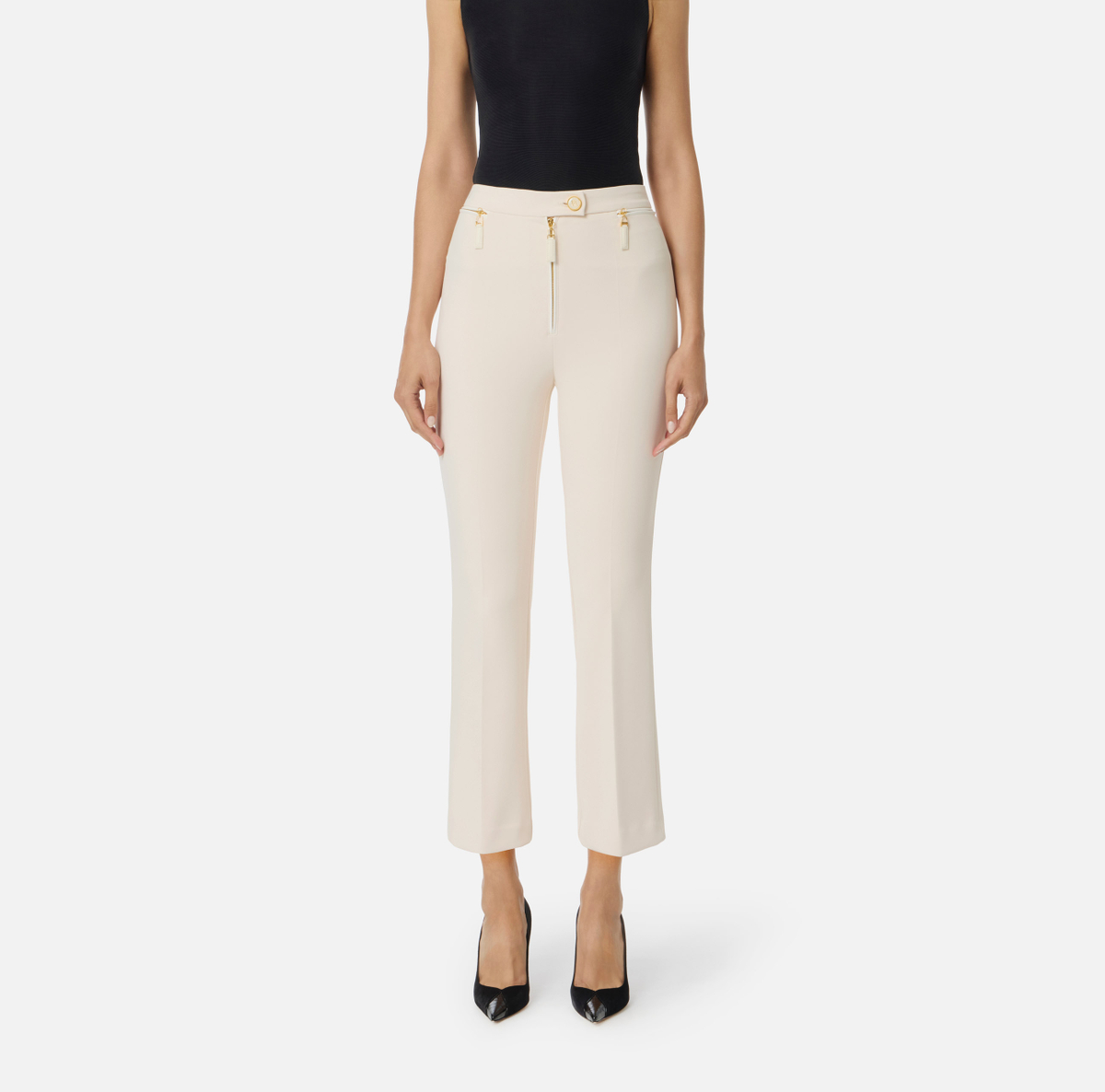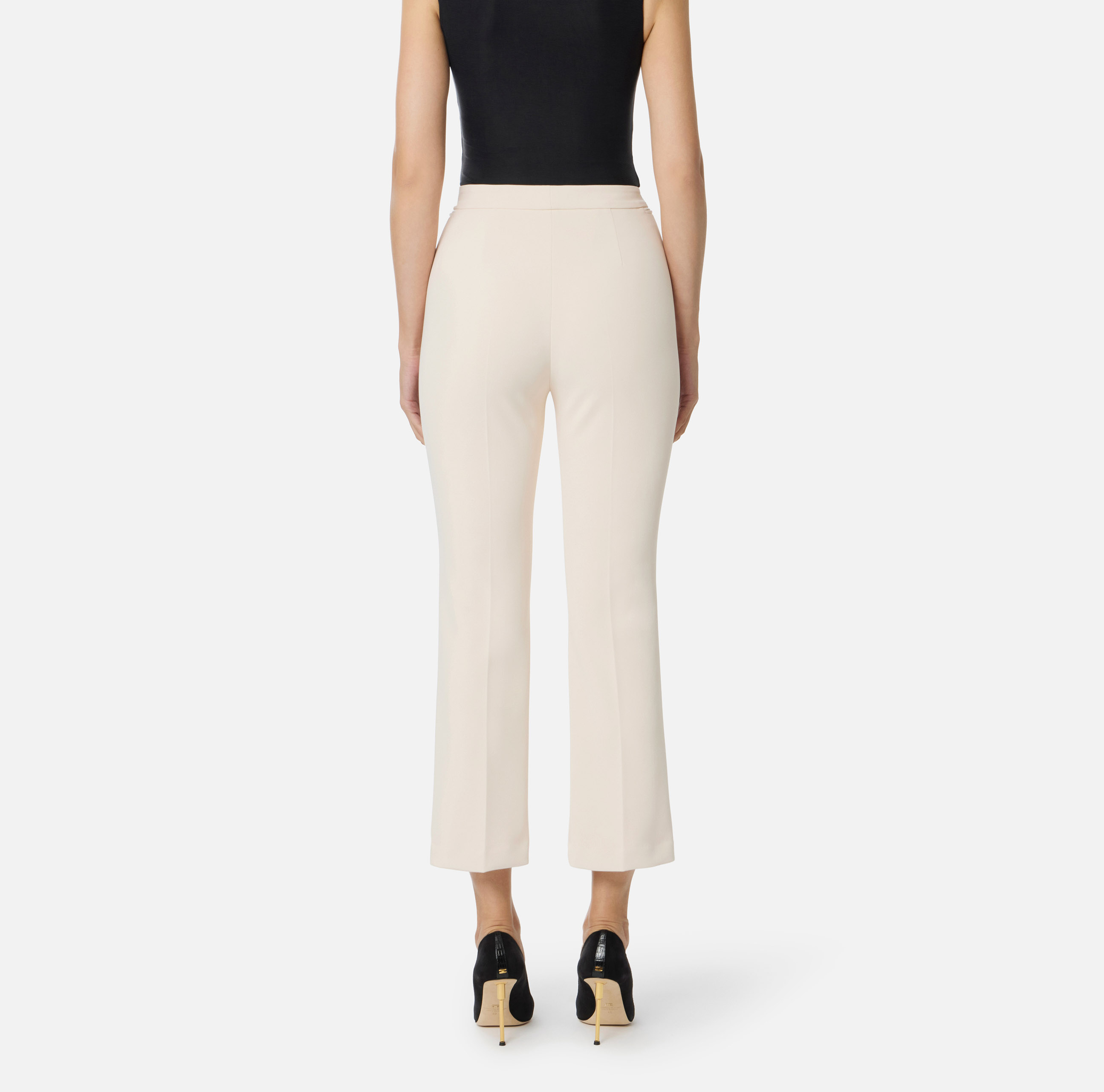 Pantalone a zampa vita alta in crêpe stretch con fascione in raso. È caratterizzato da bottoniera sul bacino