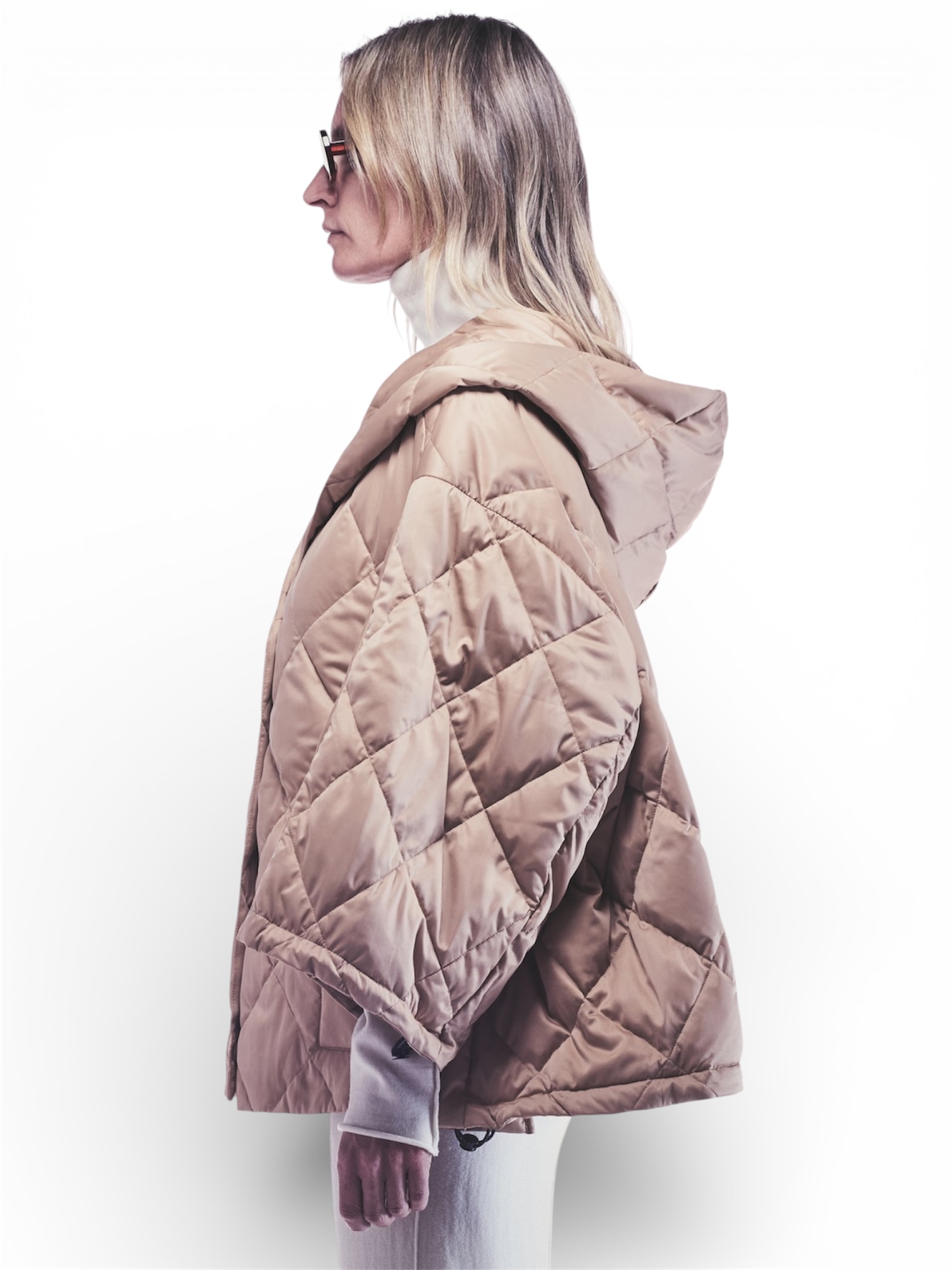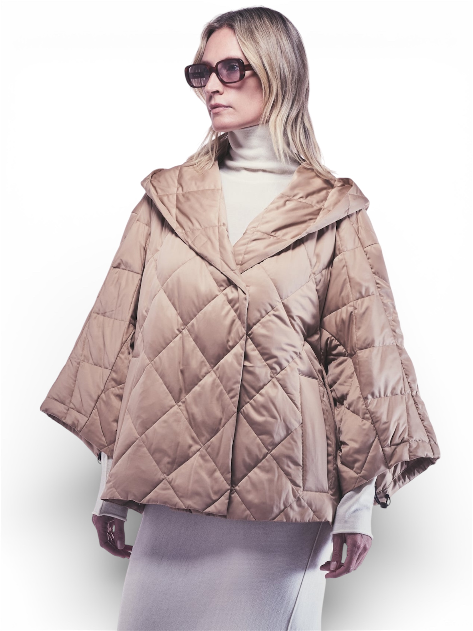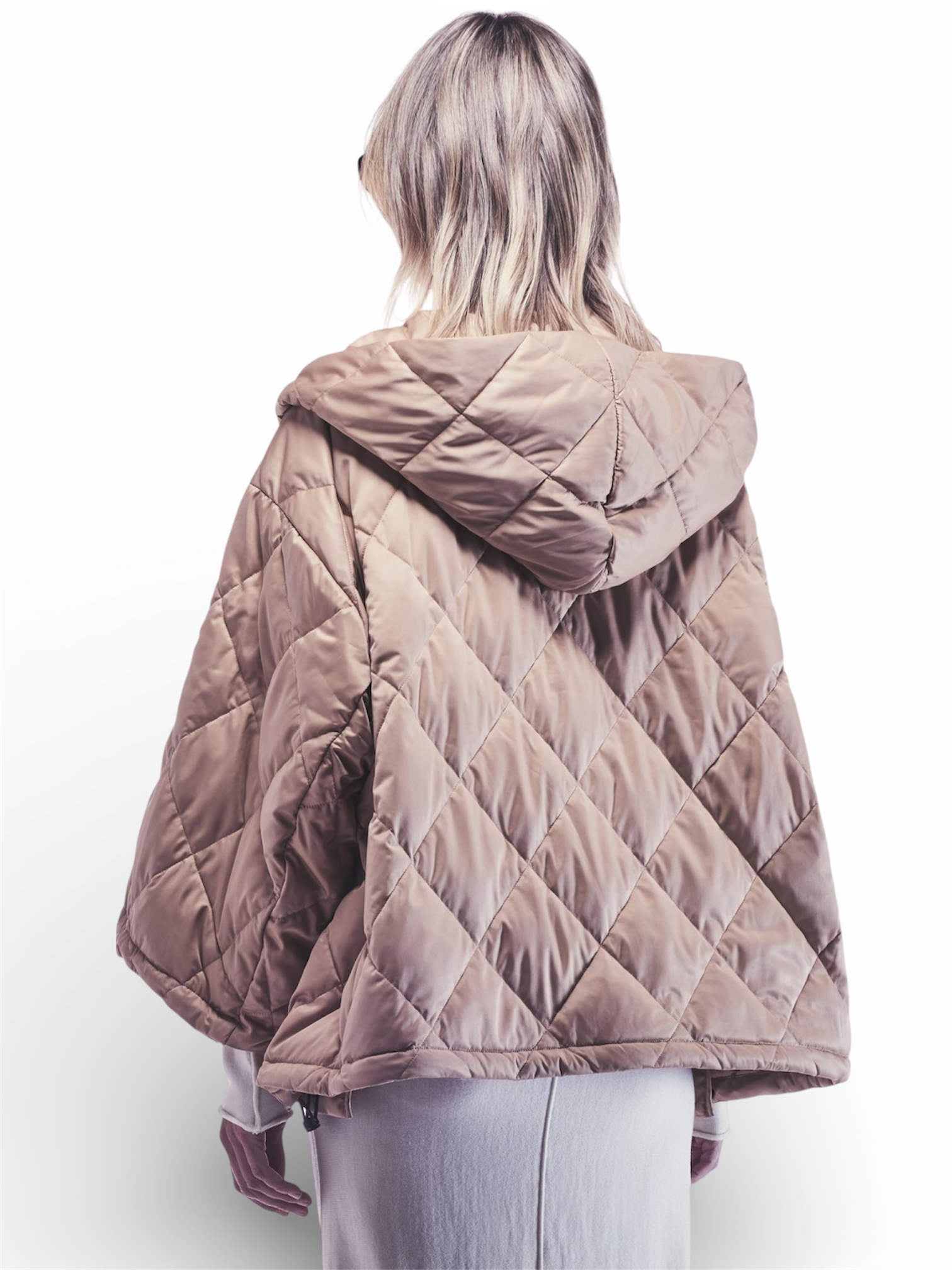 CAPPA IMBOTTITA IN PIUMINO DI RASO CON MOTIVO A ROMBI, DOTATA DI AMPIO CAPPUCCIO E CHIUSURA FRONTALE CON GANCIO NASCOSTO. FODERATA INTERNAMENTE. LINEA AMPIA E VESTIBILITÀ OVER.