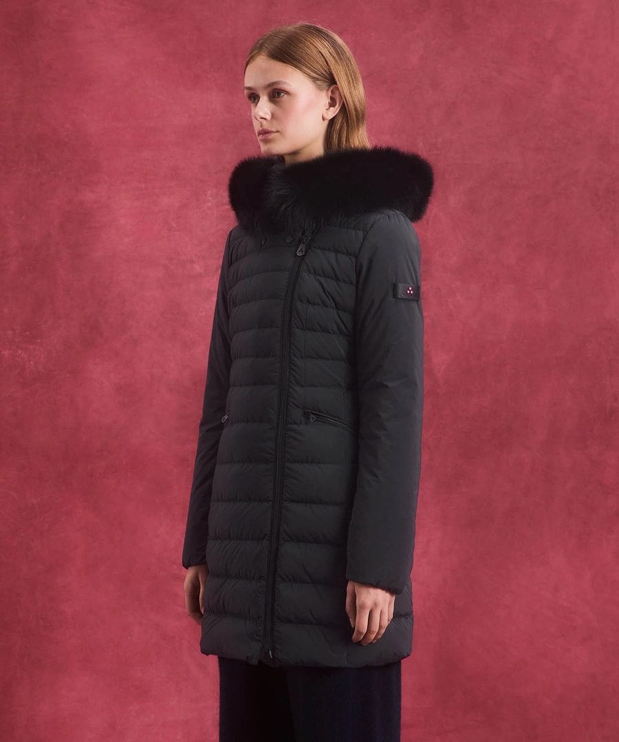 Piumino Serioa Nero Con Pelliccia Peuterey in tessuto tecnico leggero, polveroso al tatto per la temperatura di tintura e idrorepellente.
