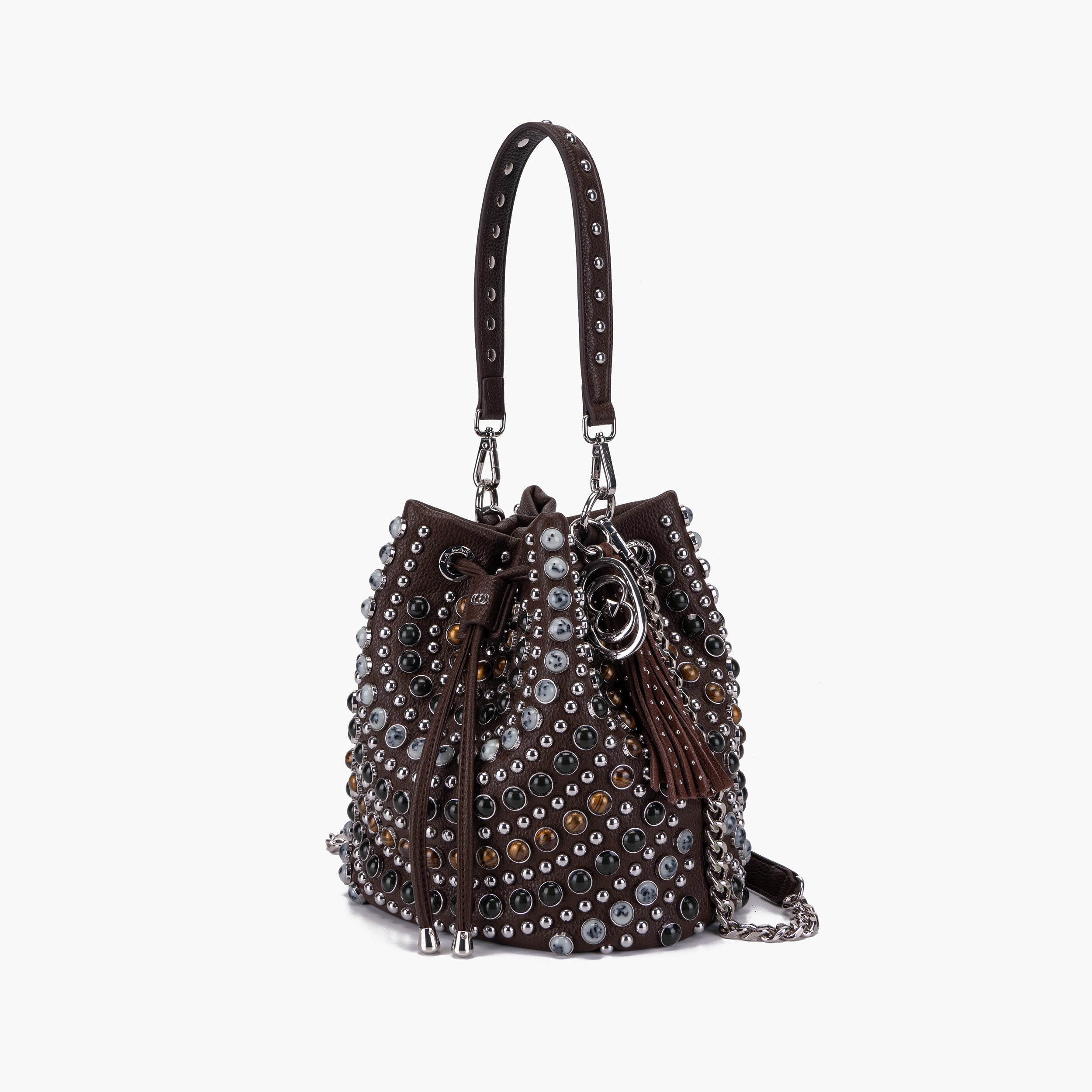 Secchiello in ecopelle martellata con applicazioni di borchie e pietre dure con cabochon; manico e tracolla rimovibili