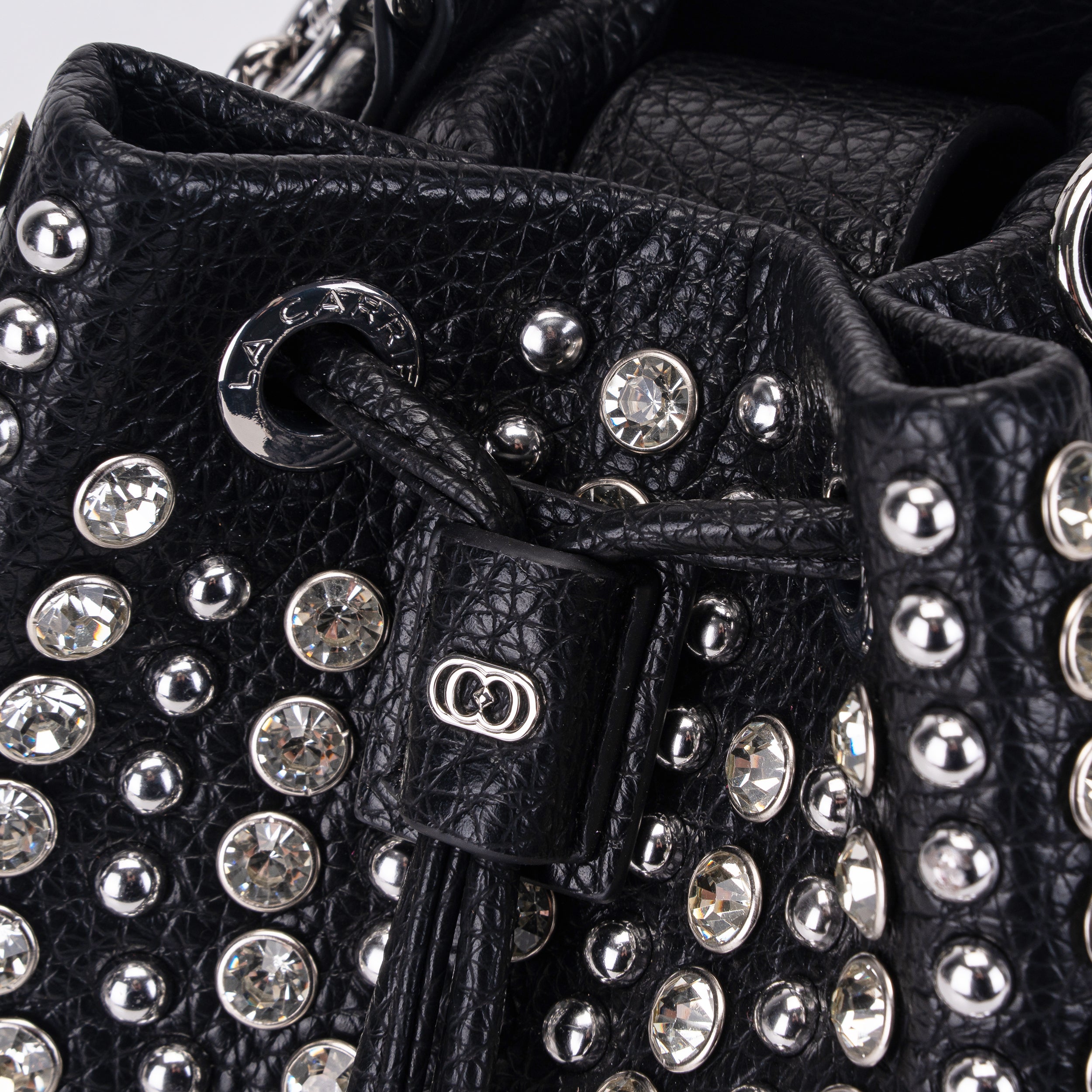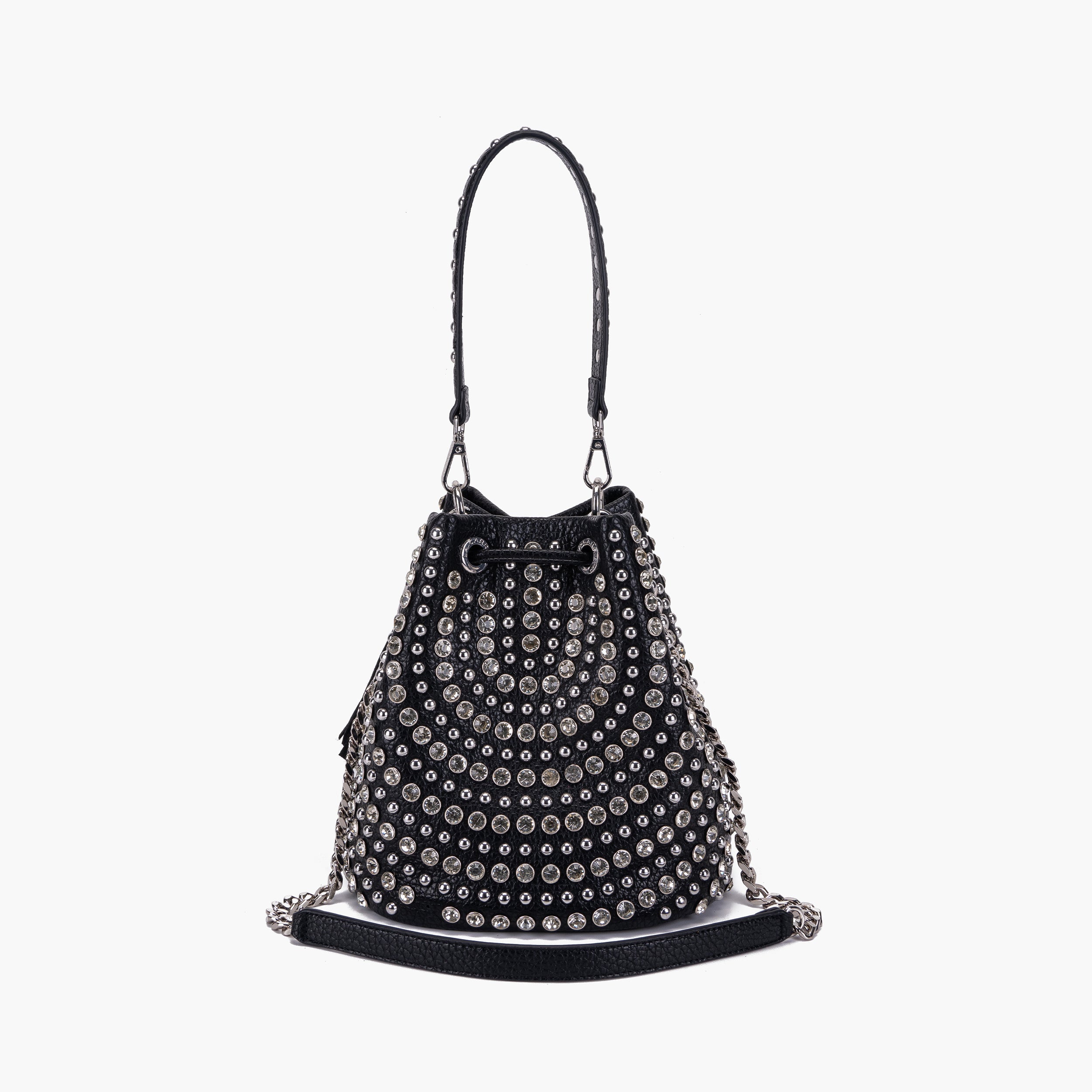 Secchiello Mirror in ecopelle martellata con borchie e strass applicate, manico e tracolla rimovibili