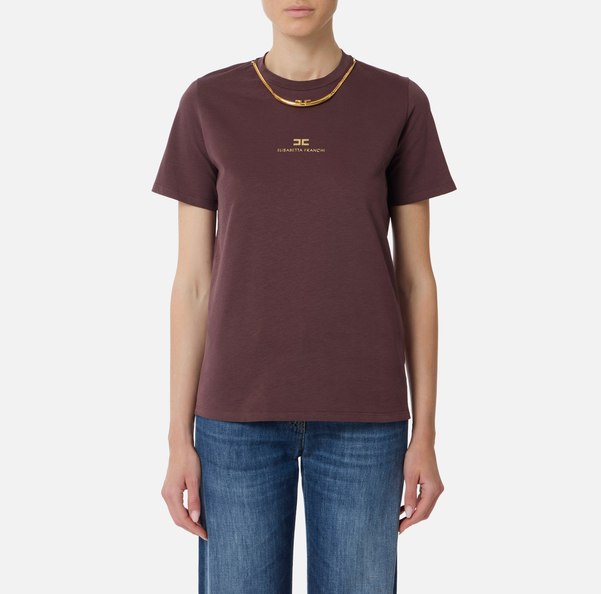 Maglietta a maniche corte in jersey di cotone. È impreziosita dalla collana amovibile con catena, logo centrale ed elementi tubolari in metallo dorato. Il logo a rilievo regala un’ultima nota di luce. Vestibilità regular.