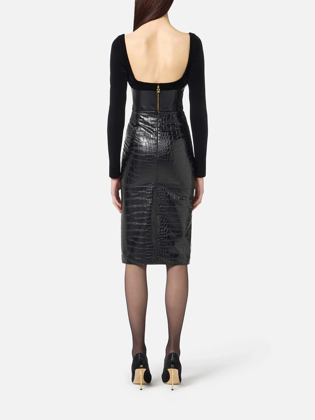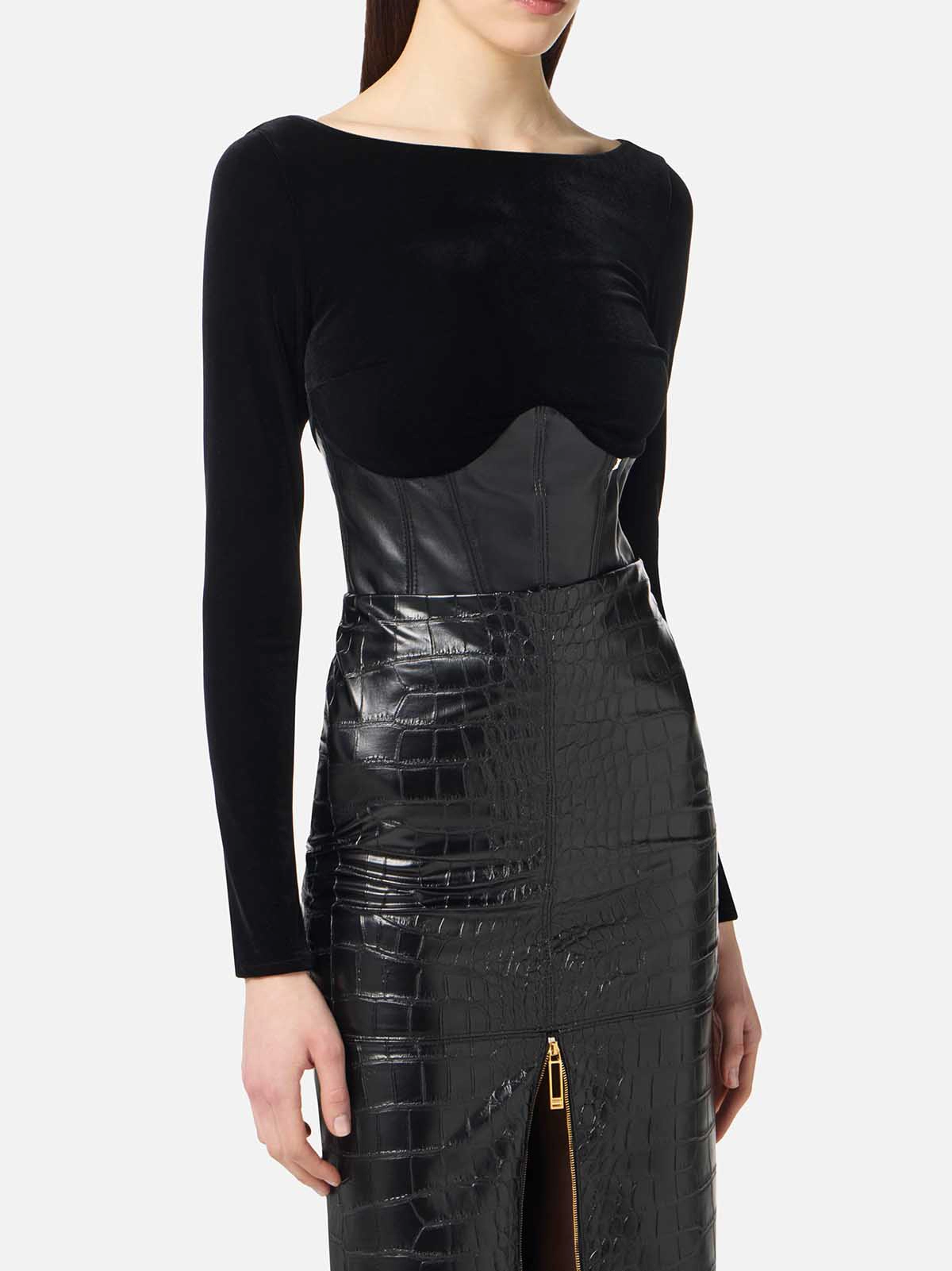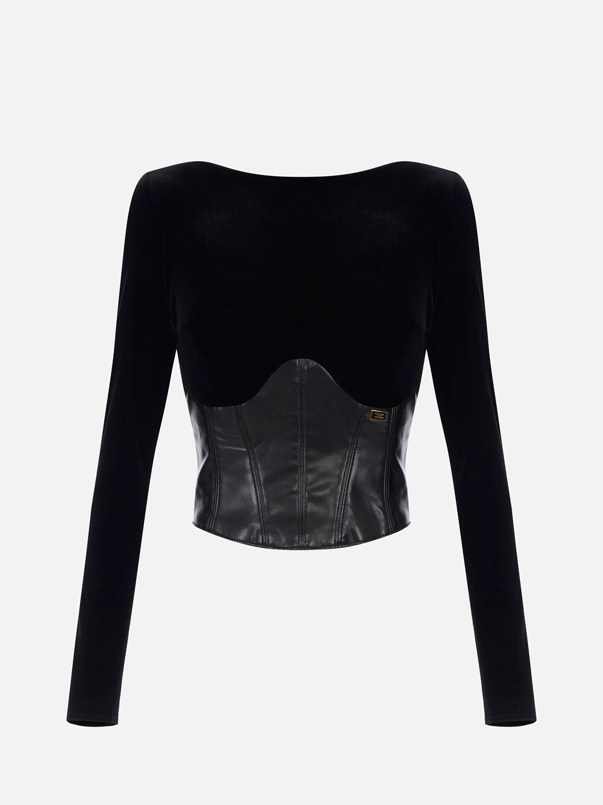 Top Elisabetta Franchi. SKU MD01357E2. Elisabetta Franchi Top in velluto dalla vestibilità aderente. Ha scollo ampio sul retro e maniche lunghe. Si distingue per la costruzione a bustier che avvolge la vita, con stecche interne a donare una silhouette definita. Un piccolo dettaglio con logo completa il capo. Dettagli: Fodera in maglina Inserti in materiale sintetico effetto pelle Dettaglio in metallo dorato con logo Zip sul retro Lunghezza 50 cm per la taglia 40 IT La modella è alta 177 cm e indossa una taglia 40 IT Composizione articolo 90%Poliestere 10%Elastane Vestibilità Slim