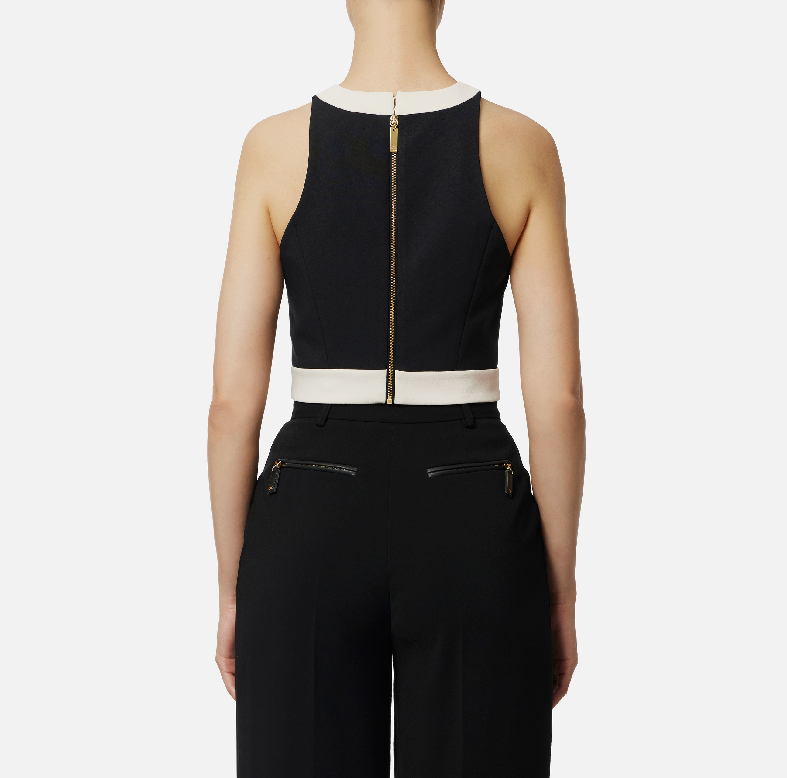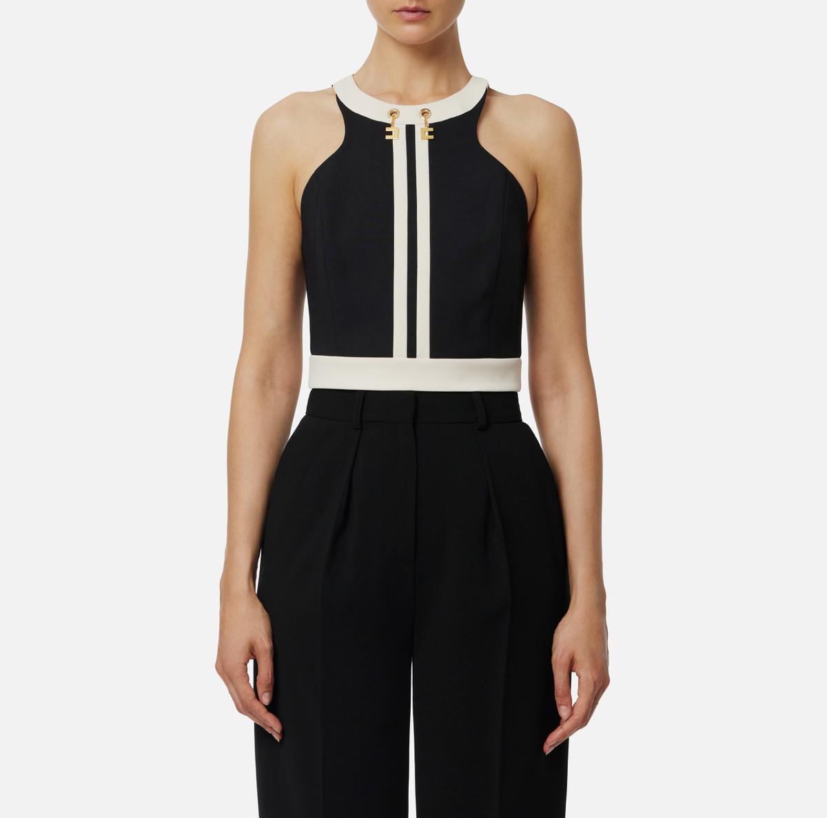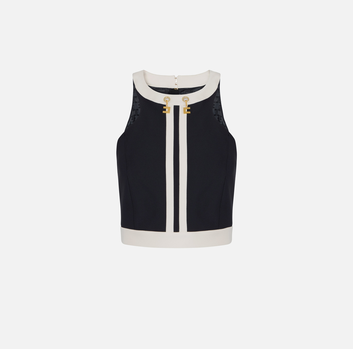 Top in doppio crêpe dalla vestibilità aderente. Si distingue per gli inserti in colore a contrasto che creano sofisticati color-block. Focus sui dettagli: i gemelli con catena e logo pendenti creano movimento e lucentezza.